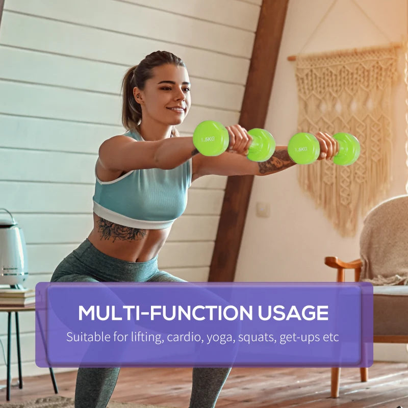- Dimensions: Each dumbbell set includes two 0.5kg, two 1kg, and two 1.5kg dumbbells, with overall dimensions of 7.5Hcm x 43L x 18Wcm.