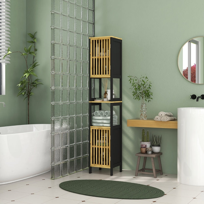 - Duo storage: This tall bathroom cabinet features a top and bottom cupboard along with two middle open shelves for versatile storage options.