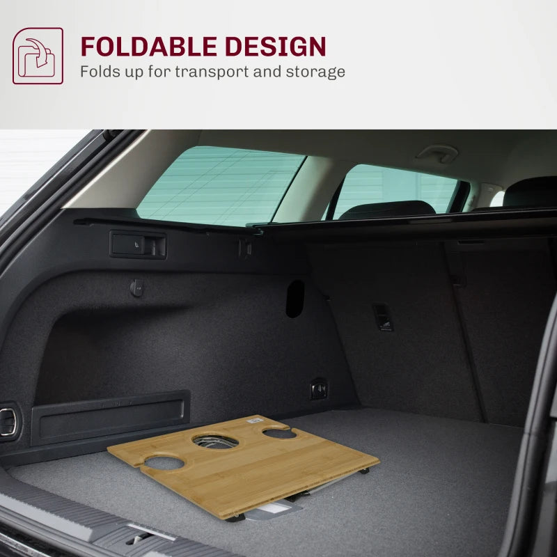 - Bamboo tabletop: The portable table features a naturally beautiful bamboo surface with a varnished finish for added protection.