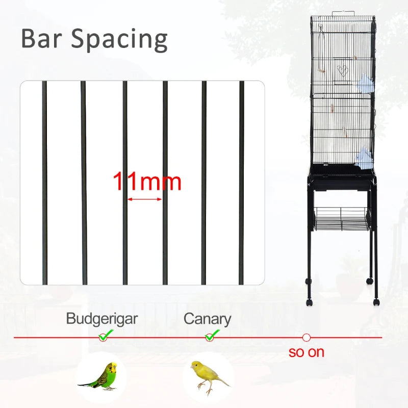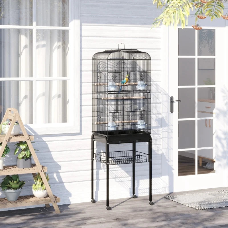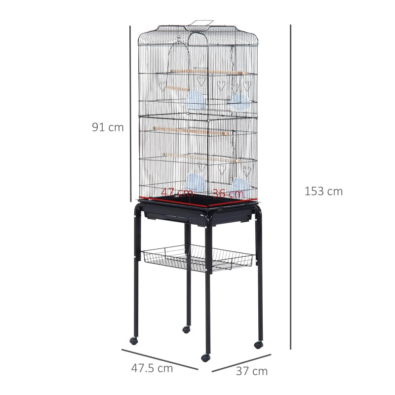 - Four-wheel stand enables easy movement of the cage with minimal disruption for your bird. Dimensions: Whole - 153H x 47.5L x 37Wcm, Cage - 91H x 47L x 36Wcm. Assembly is required.