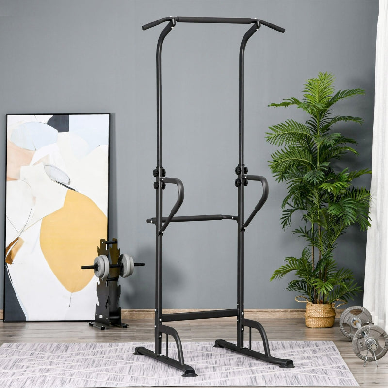 - Foot pads for floor protection and stability, maintaining the pull-up tower's structure. Dimensions: 180-212H x 98L x 102Wcm.