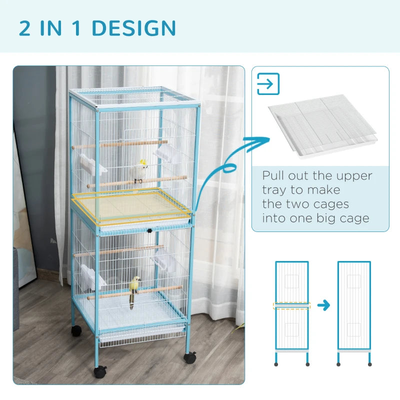 - 2 in 1 Spacious Bird House: The lower shelf and tray of the upper cage can be extended to create a larger cage, allowing your feathered companions ample space to move around, stretch their wings, and explore. This budgie cage is furnished with two wooden perches and two plastic food containers for their daily needs.