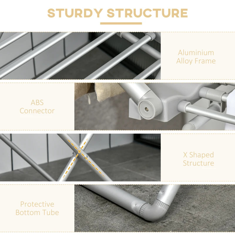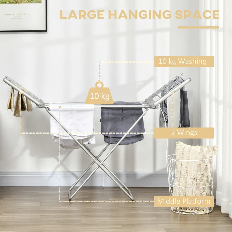 - Fold-Out Wings: The heated clothes airer features fold-out wings with two side rails, providing extra space for longer garments and preventing them from touching the floor.