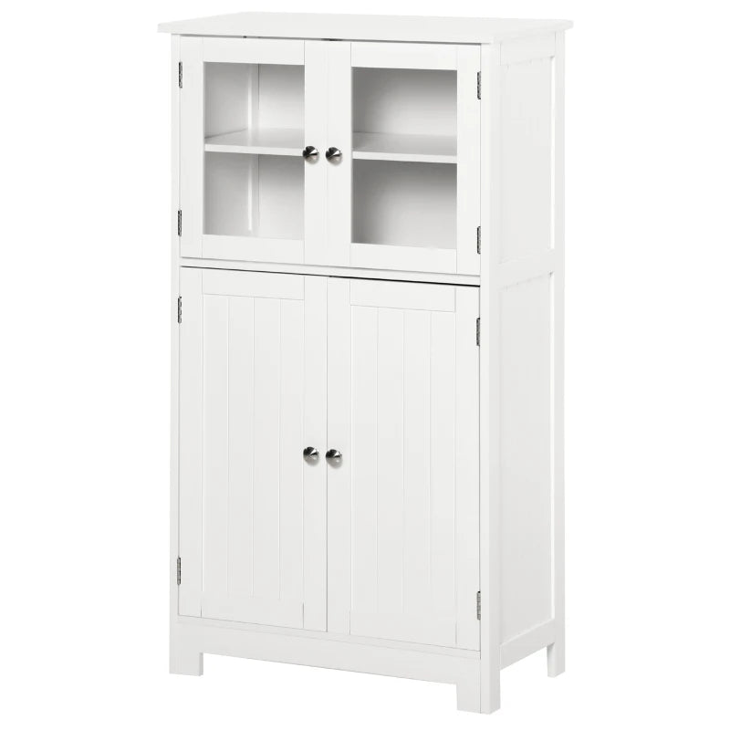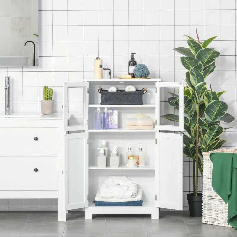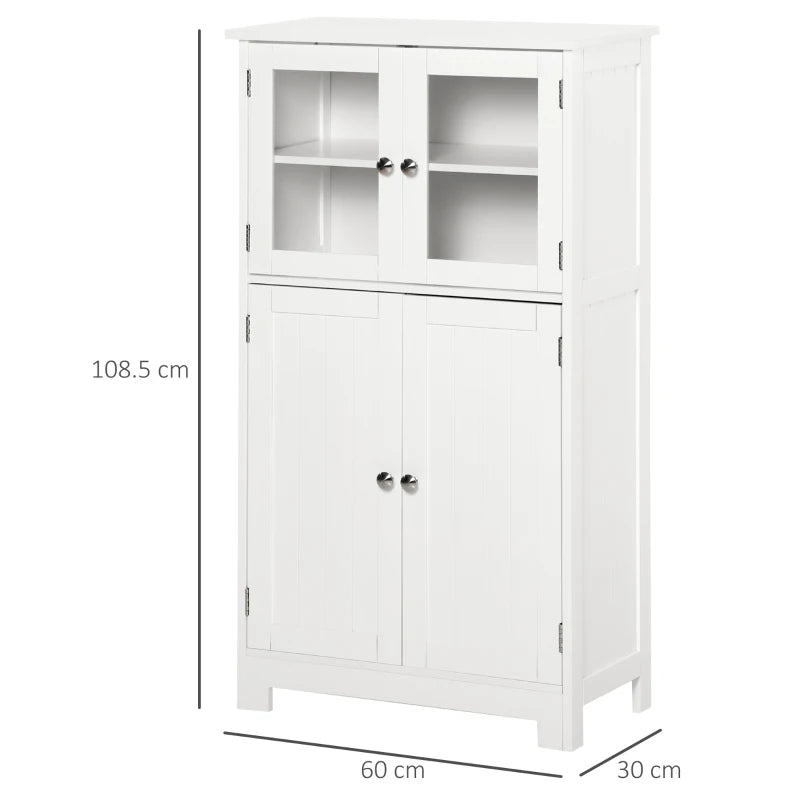 - DUO STORAGE: This cabinet offers concealed bottom storage and a top storage area with two glass doors for easy visibility. Ideal for organising toiletries, towels, and other bathroom essentials.